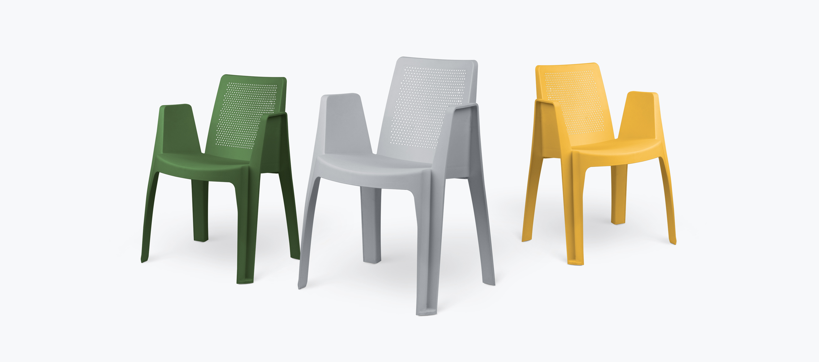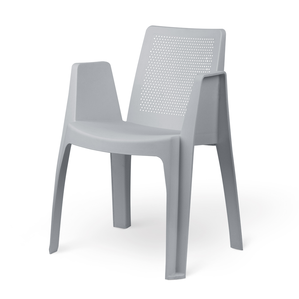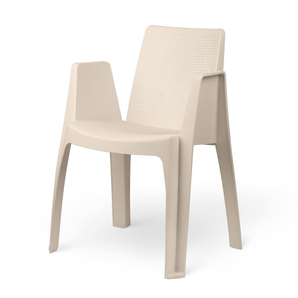 صندلی دسته دار پلیمری یک تکه از جنس پلی پروپیلن تقویت شده با مواد معدنی؛ در دو طرح پشتی متفاوت؛ سطح ظاهری با جلوه مات؛ رعایت اصول ارگونومی؛ قابل ارائه در ۹ رنگ؛ مقاوم در برابر اشعه ماوراء بنفش، نشیمن عمیق و تکیه گاه بلند.