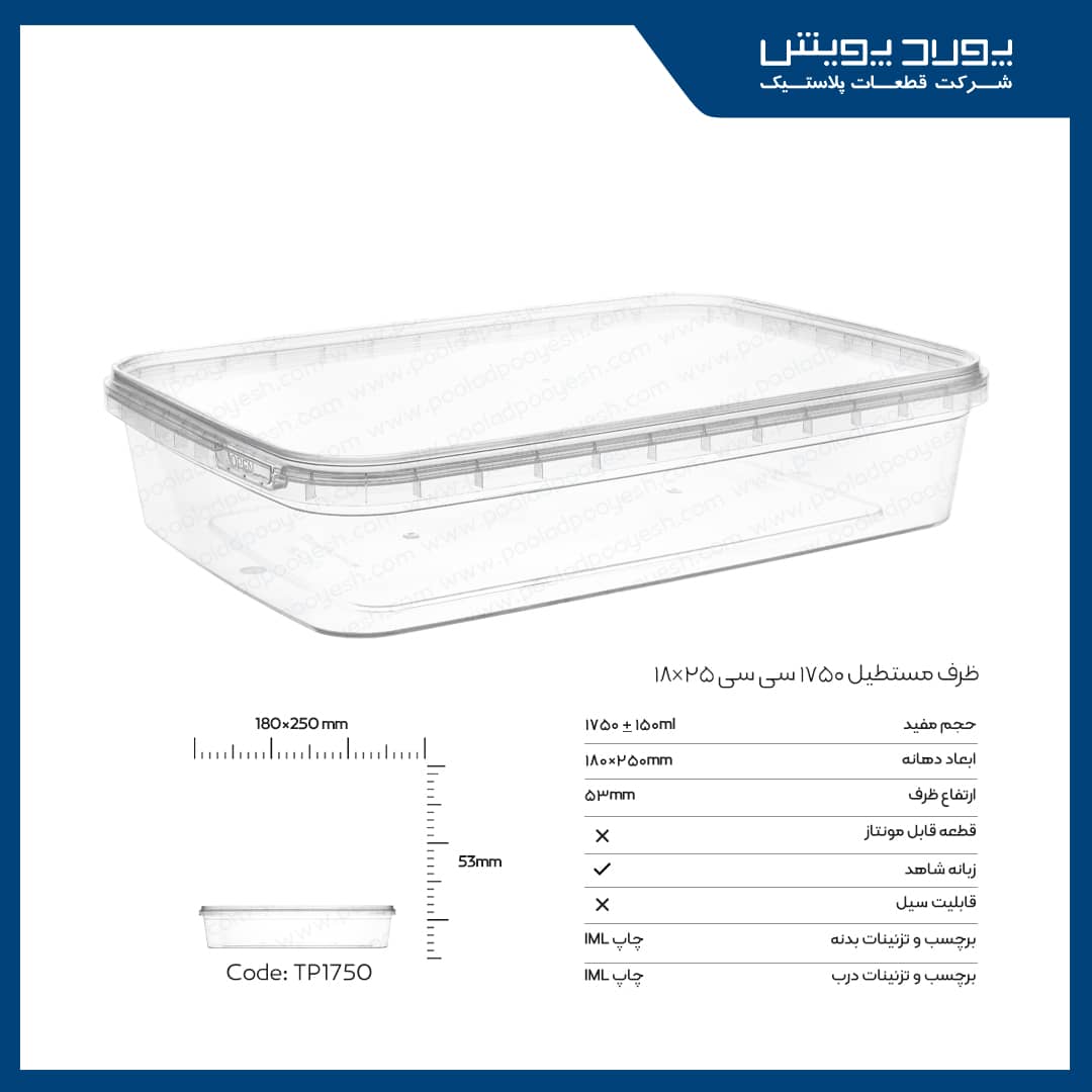 آشپزی و سازماندهی با ظرف مستطیل پولاد پویش شفاف 1750 سیسی (بسته 120 عددی) به اوج میرسد! این ظروف با ظرفیت بالا و شفافیت استثنایی، انتخابی ایدهآل برای نگهداری مواد غذایی تازه و مرتبسازی در آشپزخانه شما هستند. با دوام و قابل استفاده در فریزر و مایکروویو، تجربهای جدید از راحتی و صرفهجویی را تجربه کنید. بهترین همراه برای تهیه و نگهداری مواد غذایی!
