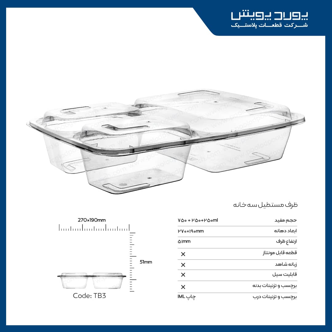 آمادهاید تا به سازماندهی و نگهداری مواد غذایی خود شکلی جدید بدهید؟ ظرف مستطیل پولاد پویش مشکی سه خانه، با بستهبندی 140 عددی، انتخابی ایدهآل برای مصارف خانگی و تجاری است. کیفیت برتر، طراحی شیک و تقسیمبندی کاربردی، این محصول را به گزینهای بیرقیب برای نگهداری غذا تبدیل کرده است. همین حالا خرید کنید و تغییری جدید را تجربه کنید!